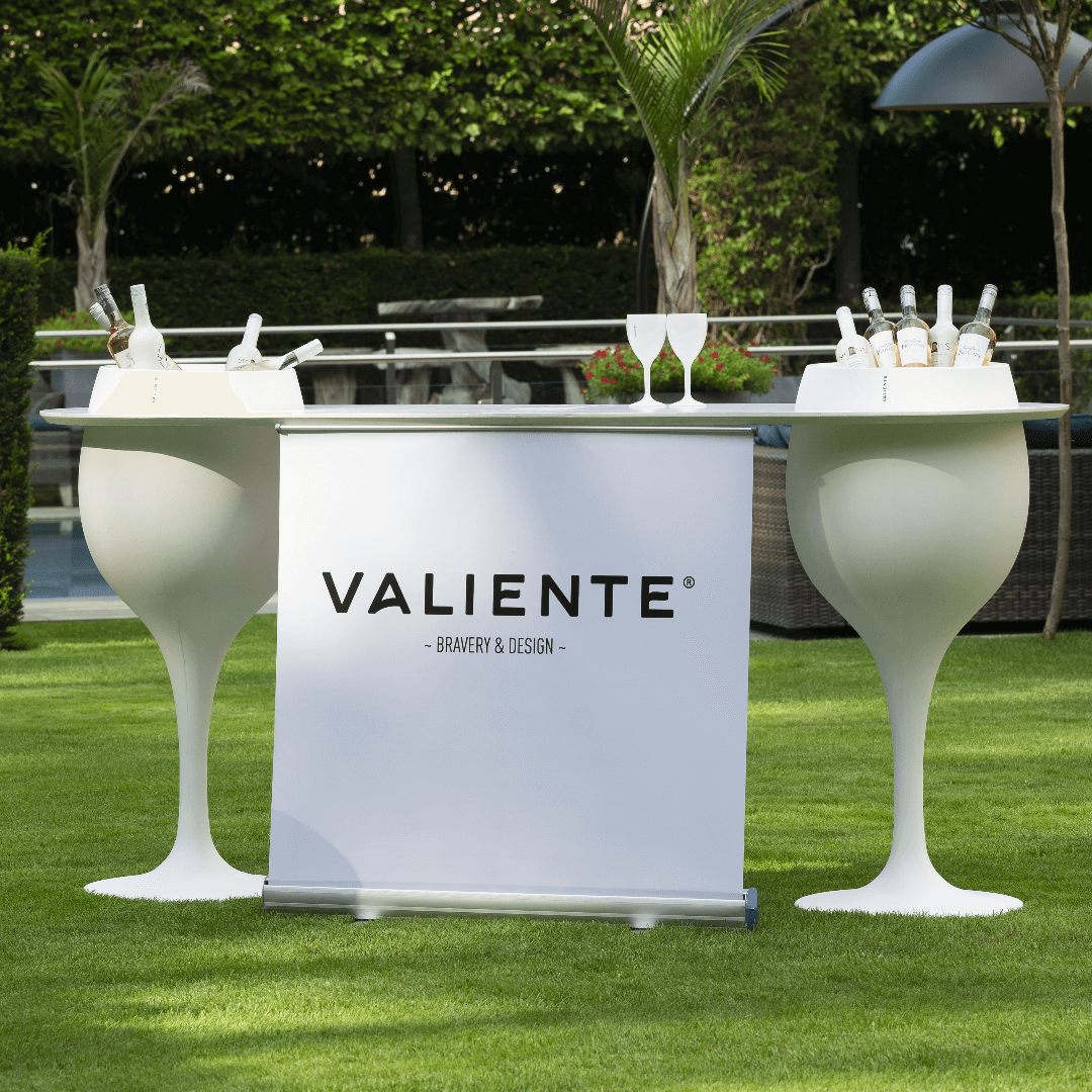 Suitable for any party or event; our exclusive Bar Classic consisting of a foldable bar top white/black, or natural, 2 Classic Icebuckets, 2 inner buckets and a Valiente® banner black/white or natural
